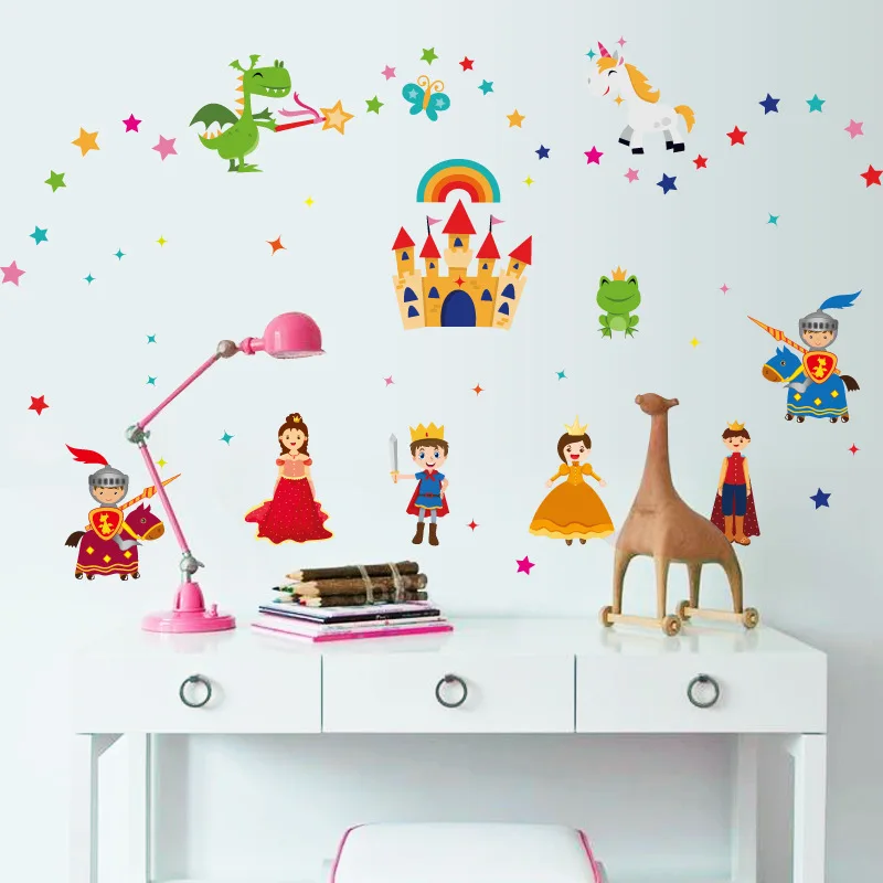 شراءمعلومات اضافية الكرتون القلعة الأمير الأميرة ملصقات جدار التنين يونيكورن ستار الديكور الطفل غرفة الأميرة غرفة خزانة ديكور PVC الشارات