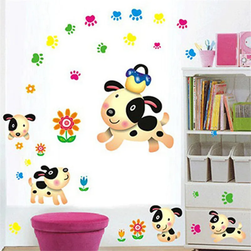 المنتجات ذات الصلة ل Children Wardrobes و لطيف الكلب بودنغ الكرتون ملصقات الحائط الأسود الأبيض كلب الزهور اللون أقدام الأطفال غرفة نوم خزانة الشارات الفينيل جدارية
